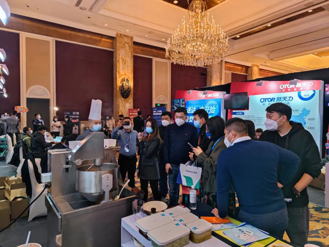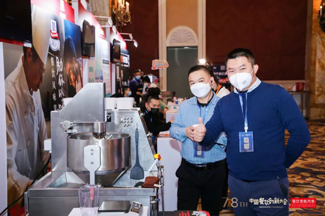在本次峰会上,智能炒菜机器人美膳狮受邀设立精品展位,并在现场进行了演示,美膳狮一开机炒制,现场“锅气十足”,迸发出“阵阵香气”,引发与会嘉宾的驻足与品鉴,广受现场商家好评。